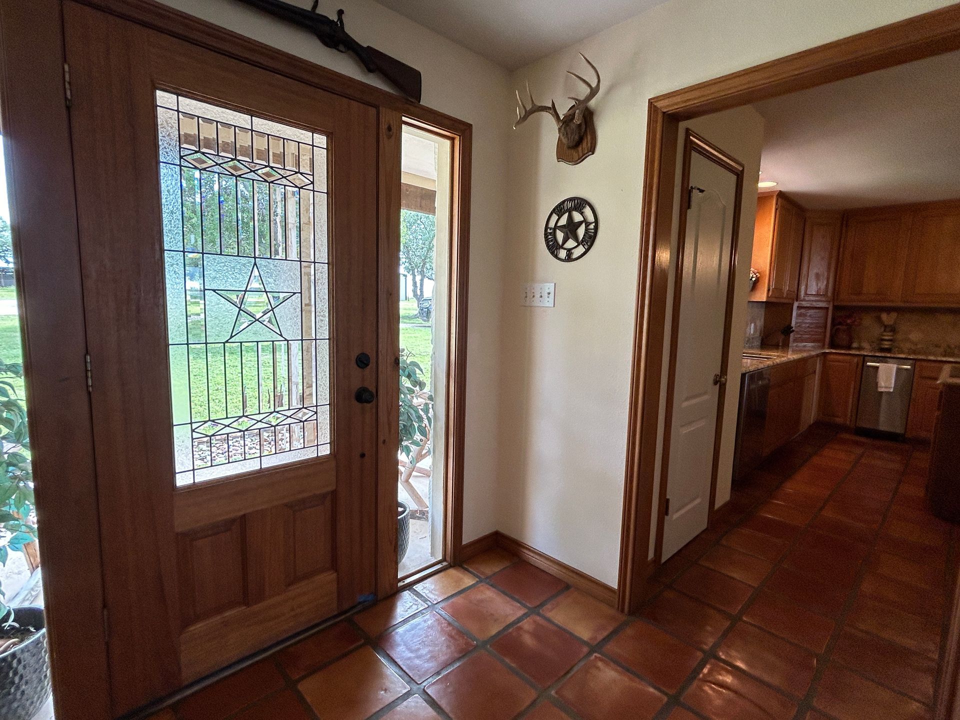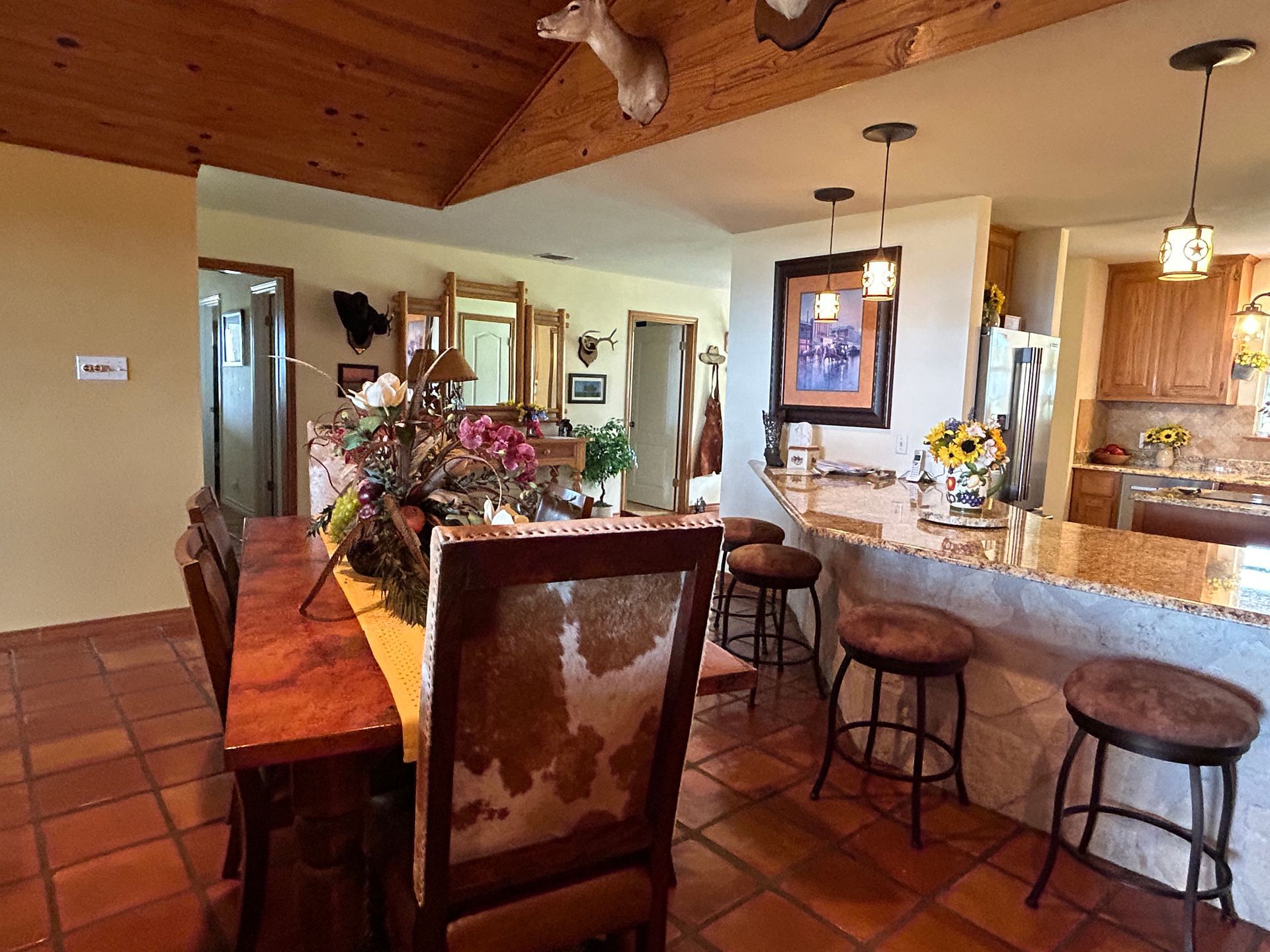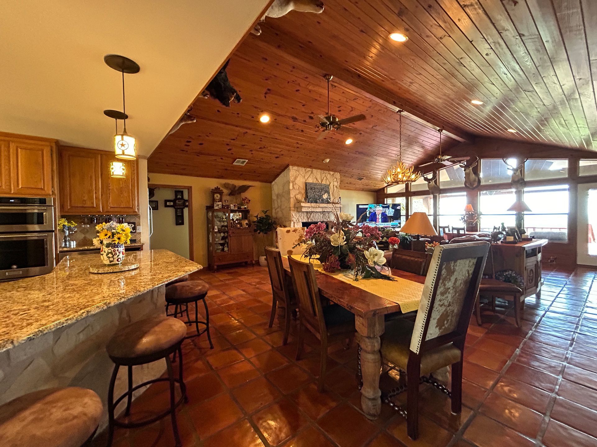 This combination ranch offers quality hunting, a home perfect for entertaining, pastures for livestock and a large shop. The 2,926 sq. ft. 4 bedroom, 3 bath Austin stone ranch home sits atop a hill overlooking the ranch with views of the Texas Hill Country. Inside you will entertain in the open concept living room, kitchen and dining room that has beautiful Saltillo tile. Enjoy the rock fireplace and beautiful wood ceiling in the living room. You will appreciate the kitchen with granite counters, a built in ice maker and wine cooler. The living room opens to an outdoor covered patio with an outdoor kitchen and above ground pool.